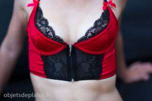 C’est principalement dans cette seconde optique que j’ai repéré, chez Lovehoney, cet épais soutien-gorge rouge à fermeture éclair sur le devant.