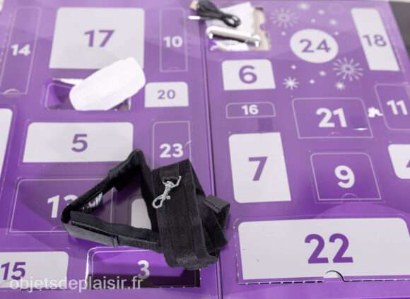 Côté accessoires BDSM, le calendrier de l’Avent coquin espaceplaisir est plutôt bien fourni. Cela reste soft, bien entendu : c’est un calendrier-surprise, un ustensile trop ciblé sur un kink précis aurait été malvenu, il faut que cela convienne à la plupart des goûts. La qualité est raisonnablement bonne, ce n’est pas non plus ultra-luxueux, mais obtenir autant d’accessoires assez sympas pour un prix total qui reste correct, c’est plutôt pas mal du tout.