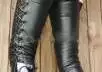 S’il y a bien un look de Dominateur (les dominatrice ont un autre habillement) qui fascine en SM c’est celui du pantalon et des bottes en cuir noir (même si certaines personnes critiquent, cela ne laisse jamais indifférent) et près du corps si possible. Polo ou chemise au choix. Je porte du tissu en été et une chemise en cuir en hiver. Mitaines aux mains et bracelet de poignet – cuir noir.