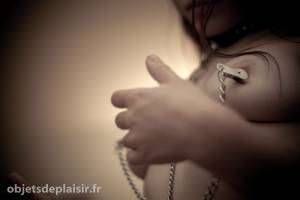 Une séance de photos BDSM, avec des pinces à seins reliées par une chaîne, un collier et une laisse. Le résultat : des photographies un brin coquines, mais qui restent assez soft.
