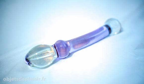 Le Purple Lover de Glassvibrations est un gode en verre violet translucide, recourbé, aux airs de baguette magique.