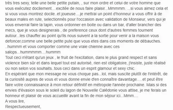 Lorsque vous recevez un message de ce type, vous vous posez des questions sur la démarche de votre interlocuteur. S’agit-il d’un copier-coller préfabriqué qu’il expédie à tout va ? Ou a-t-il passé sa soirée à rédiger cette missive à votre attention spécifique ? S‘est-il longuement tâté l’asticot en parcourant votre album photo, tout en se détaillant les tourments érotiques qu’il compte vous infliger une fois que vous aurez pris connaissance du programme ?