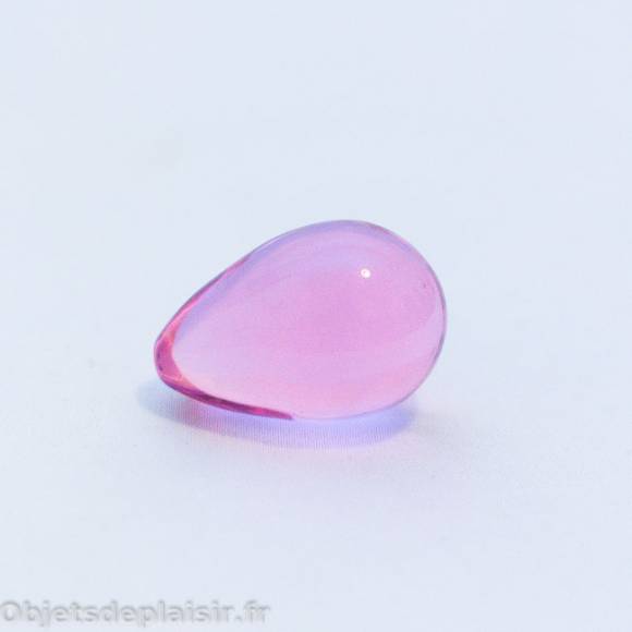 En ouvrant la boîte, nous découvrons deux objets transparents en verre rose, ayant une forme à mi-chemin entre celles d’une goutte et celle d’un œuf. Ça me fait un peu penser à des billes pour décorer les aquariums.
