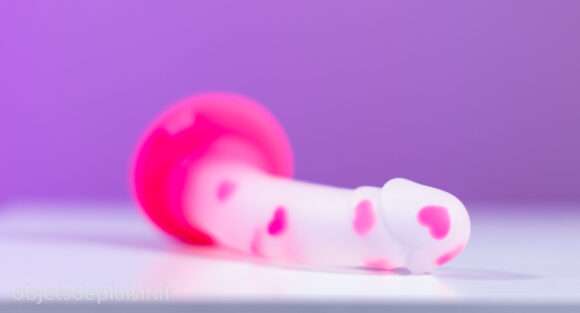 La base du sextoy est une ventouse circulaire rose fluo. Le corps du gode, quant à lui, à un aspect vraiment particulier. Il est translucide, presque transparent. A l’intérieur se trouvent des petits cœurs roses, que l’on a probablement versés dans le silicone au moment du moulage. Ceux-ci semble flotter, mais demeurent immobiles, comme suspendus dans le temps. Le résultat est fort joli.