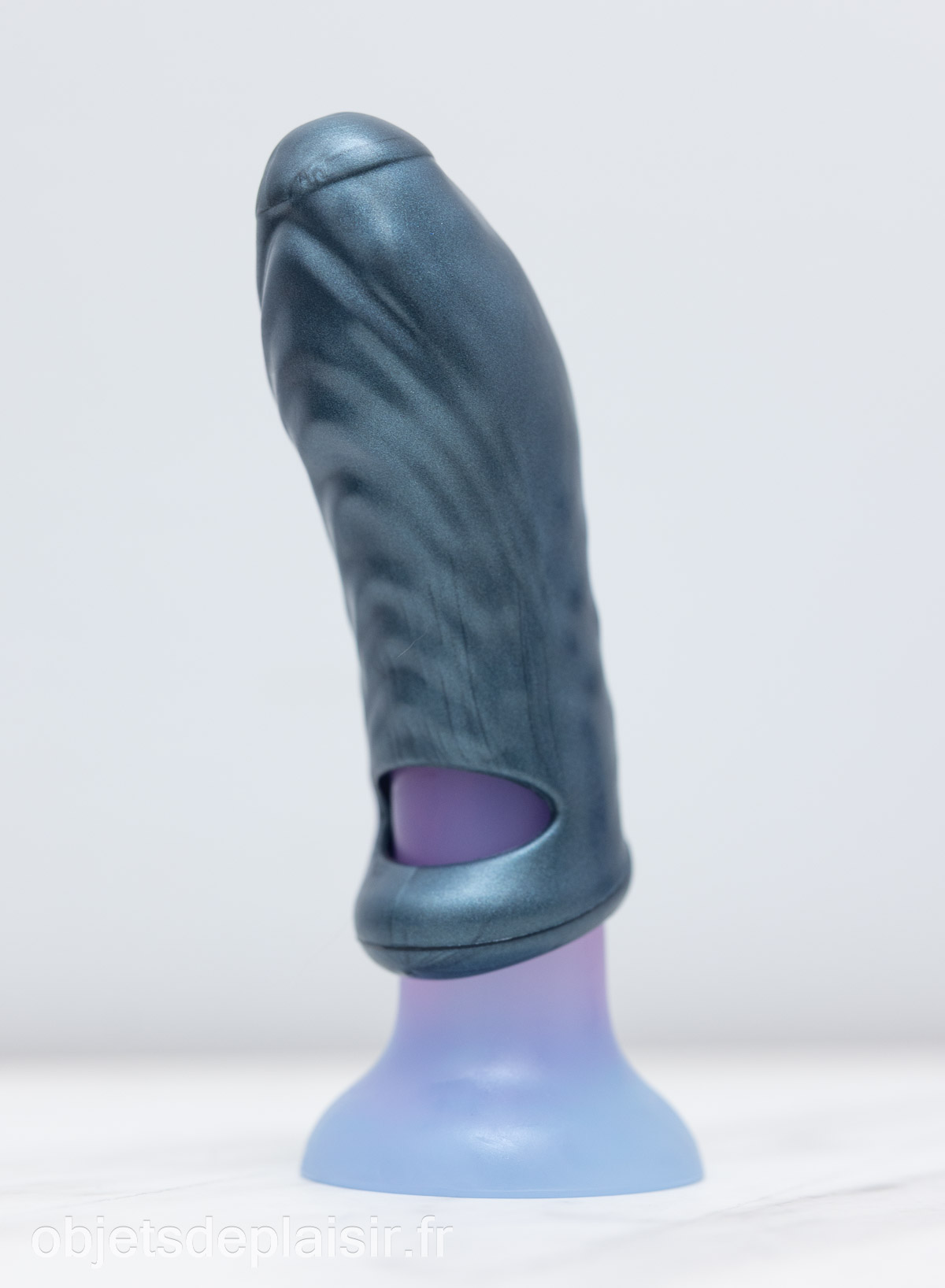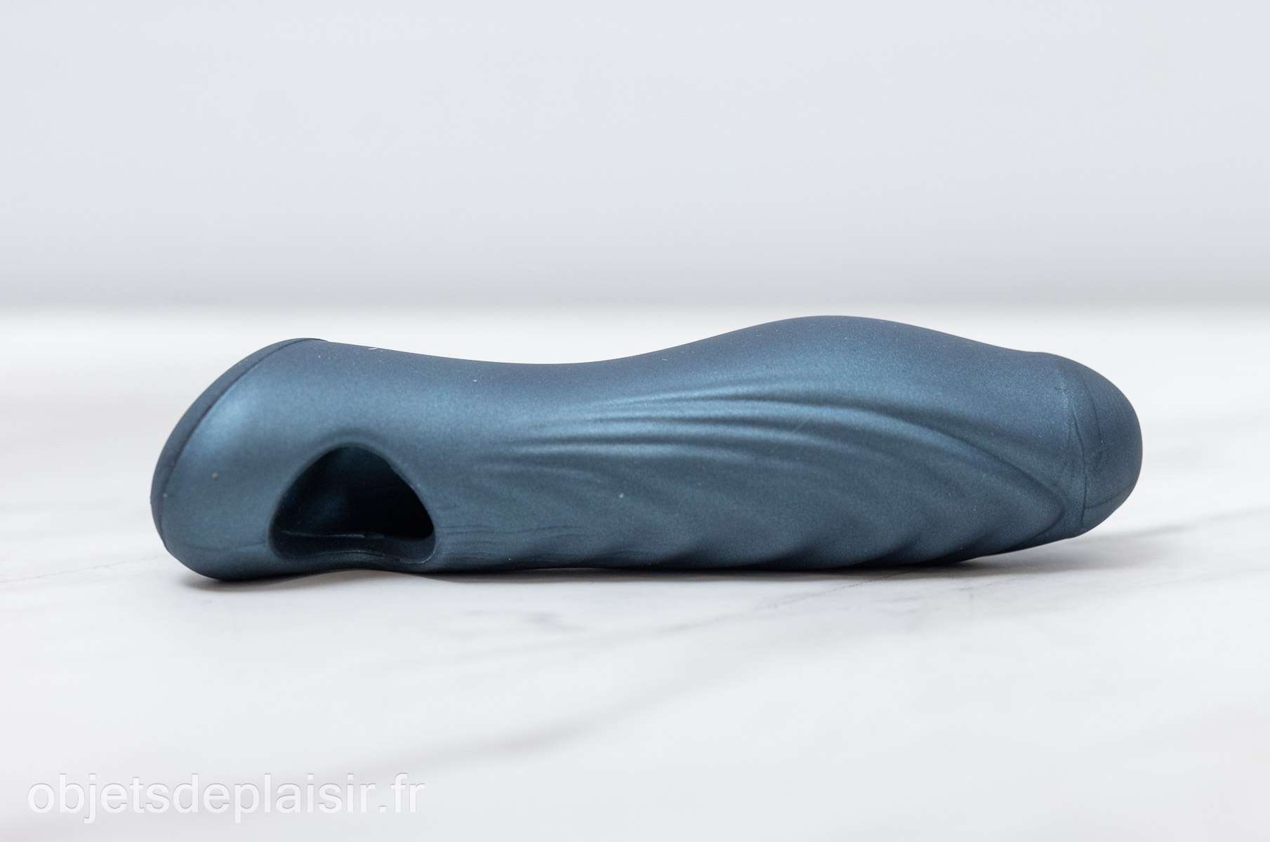 La forme est simple, presque minimaliste, et ne cherche pas à imiter l’anatomie à tout prix. C’est une gaine relativement compacte, avec un anneau à la base pour la maintenir en place, une texture extérieure ondulée, un canal interne qui accueille le pénis, avec un petit orifice à son extrémité. À sa base se trouve un cockring intégré assez épais, qui sert à maintenir la gaine en place sur le pénis.