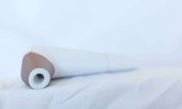 Blanc, longiligne, avec une tête saumon-doré triangulaire dotée d’un embout creux amovible blanc, le Satisfyer 2 ressemble à une espèce de pommeau de douche chelou.